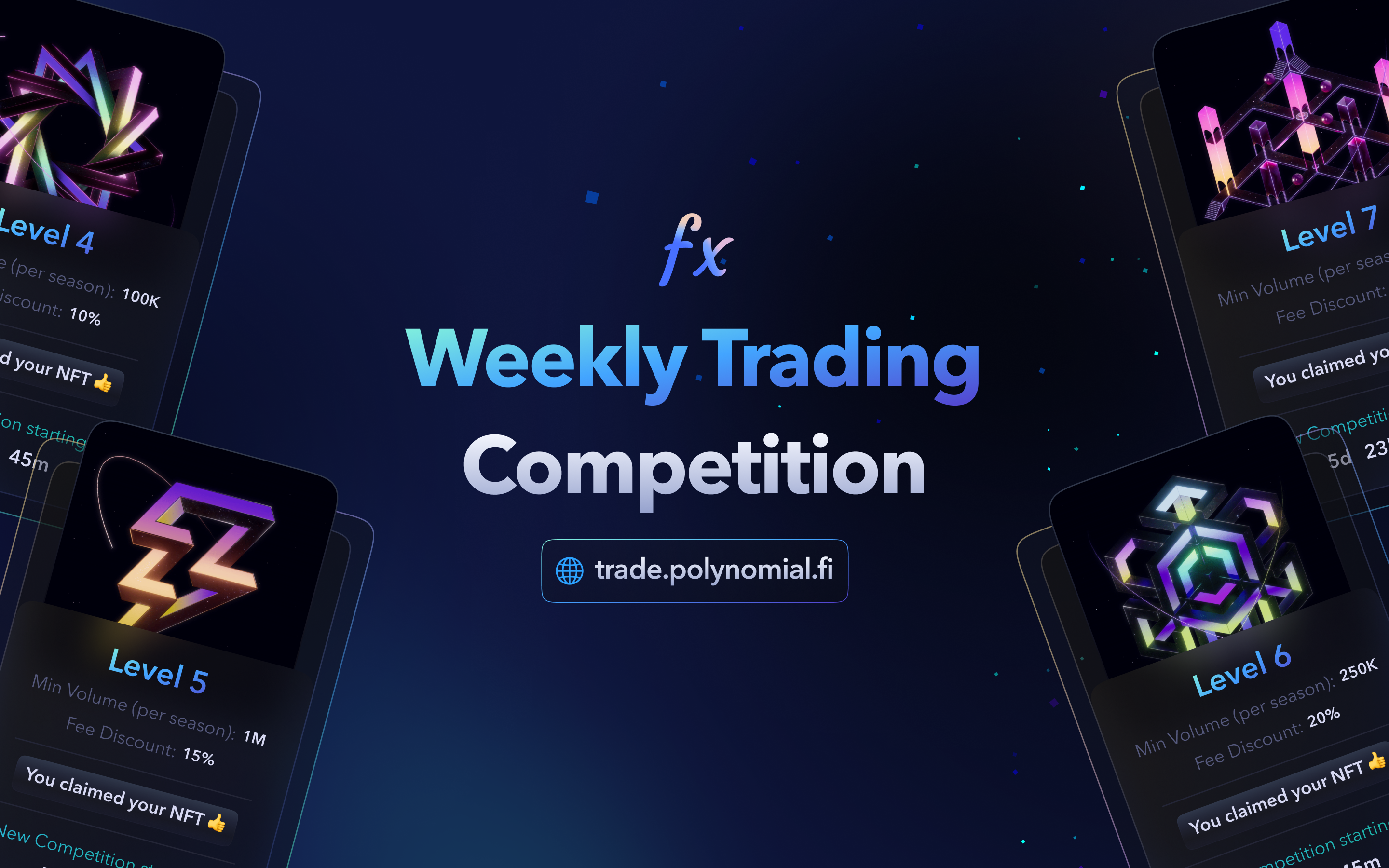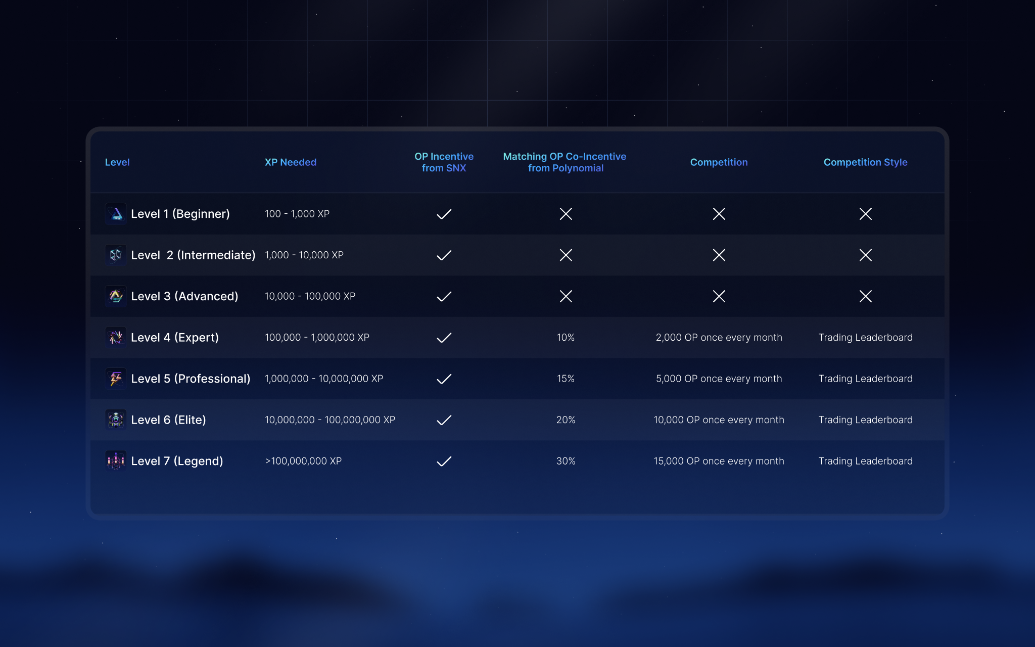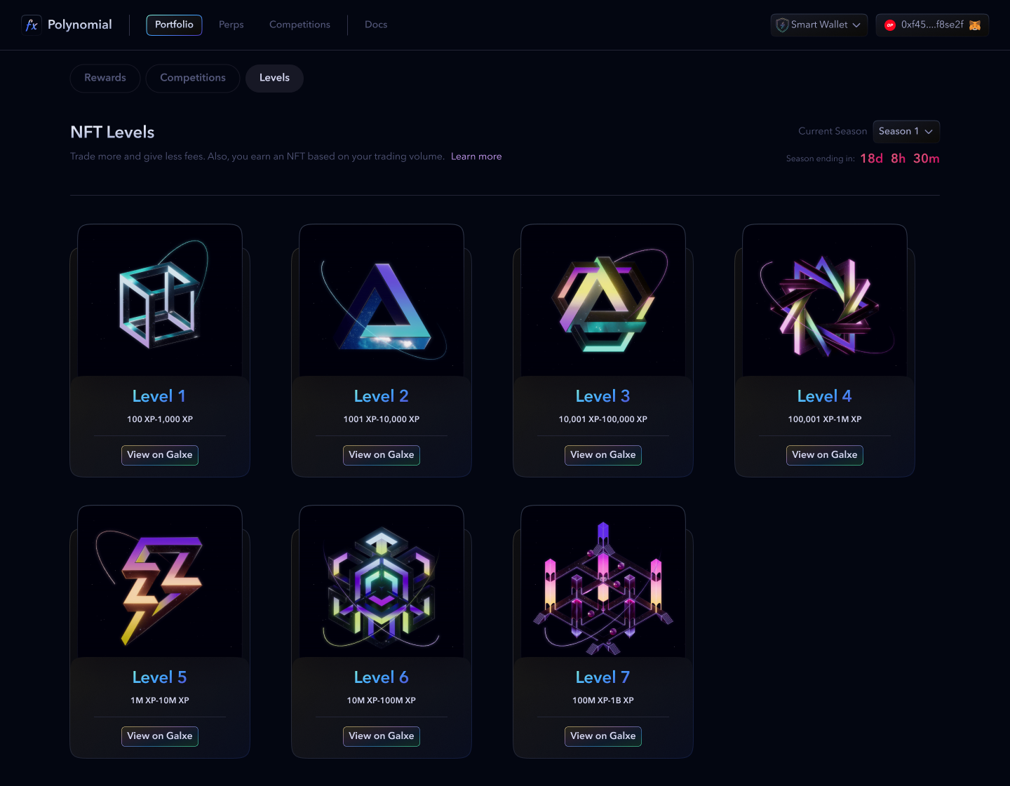 During the Trading Season (**July 4 - September 4, 2023**), traders can **level up, earn exclusive NFTs, and compete in exclusive trading competitions** on Polynomial Trade. Each level unlocks a new exclusive NFT and the chance to win $OP token prizes. Higher levels also come with a multiplier on $OP rewards, up to 30% depending on the level achieved.