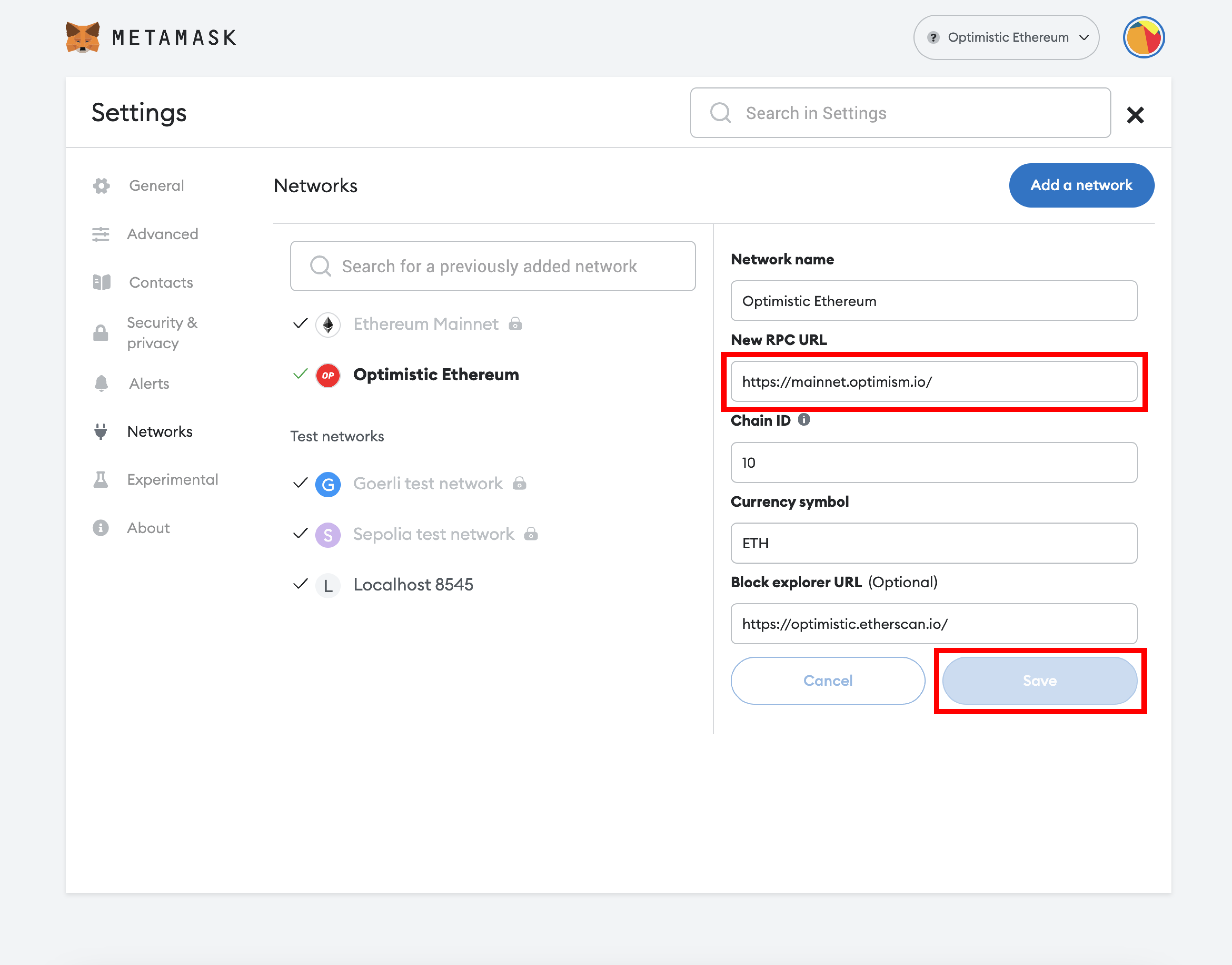 <figure><img src="https://content.gitbook.com/content/jcfC628fab27Mq32zRqN/blobs/1BFgRTP6aPiDV0ZySpJX/Group%205.png" alt=""><figcaption><p>Select "Optimistic Ethereum", insert the "New RPC URL" and <strong><code>Save</code></strong></p></figcaption></figure>