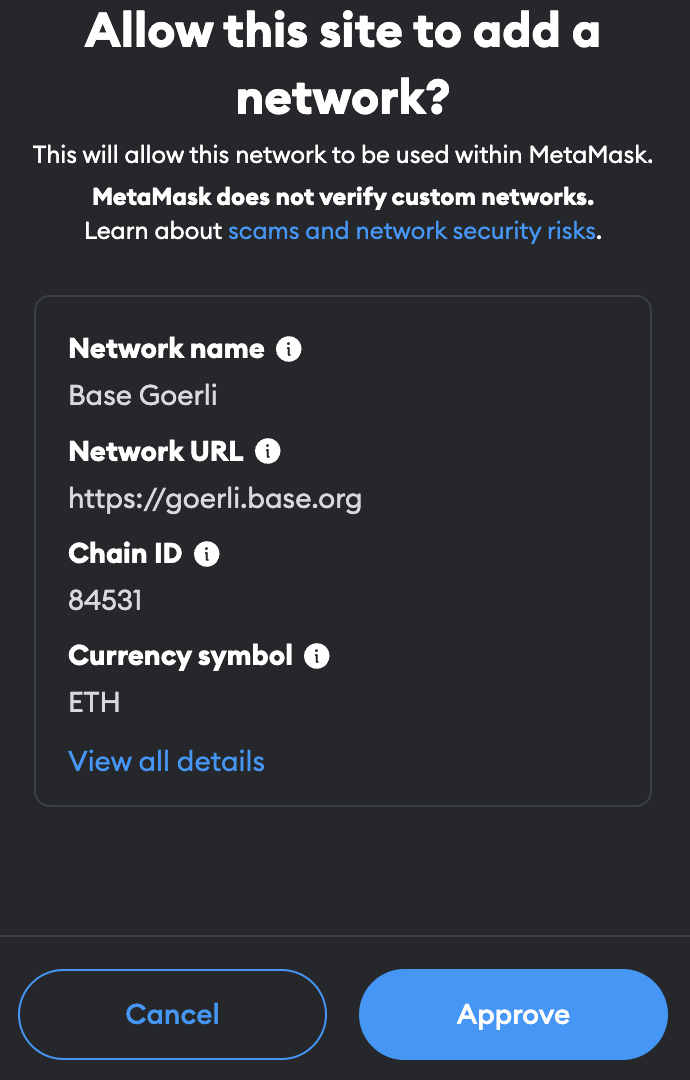 3. Metamask popup will open and show the network configuration for Base Goerli; clicking "Approve" you will configure your wallet's setting for Base Goerli.