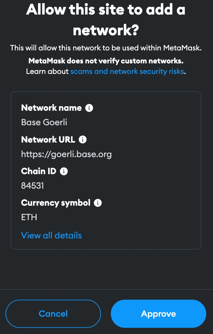 Metamask popup will open and show the network configuration for Base Goerli; clicking "Approve" you will configure your wallet's setting for Base Goerli.