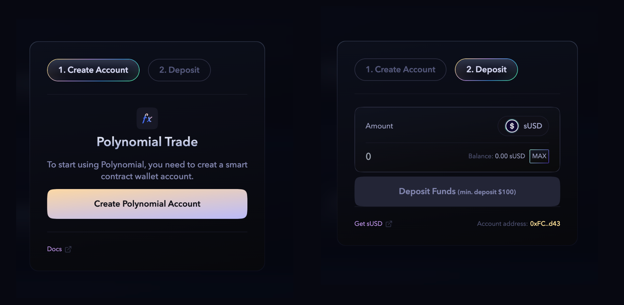 Polynomial trade uses smart contract wallets to access the exchange. Click on create an account and create a Polynomial smart account. Read more on: Smart Wallets.