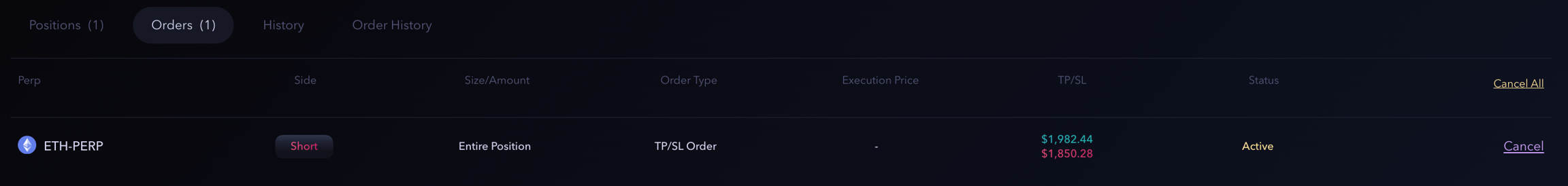 Once validate the transaction the TP/SL will be shown on Order tab and Position tab