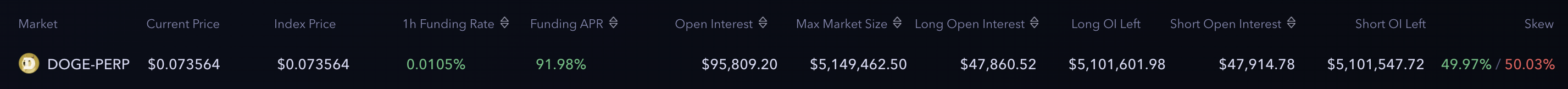 **Example 1:** Suppose we find a good opportunity in the DOGE market with a funding rate of approximately +0.01% per hour. Since positive funding means that short positions are paid by long positions, we will take a short position in this case.