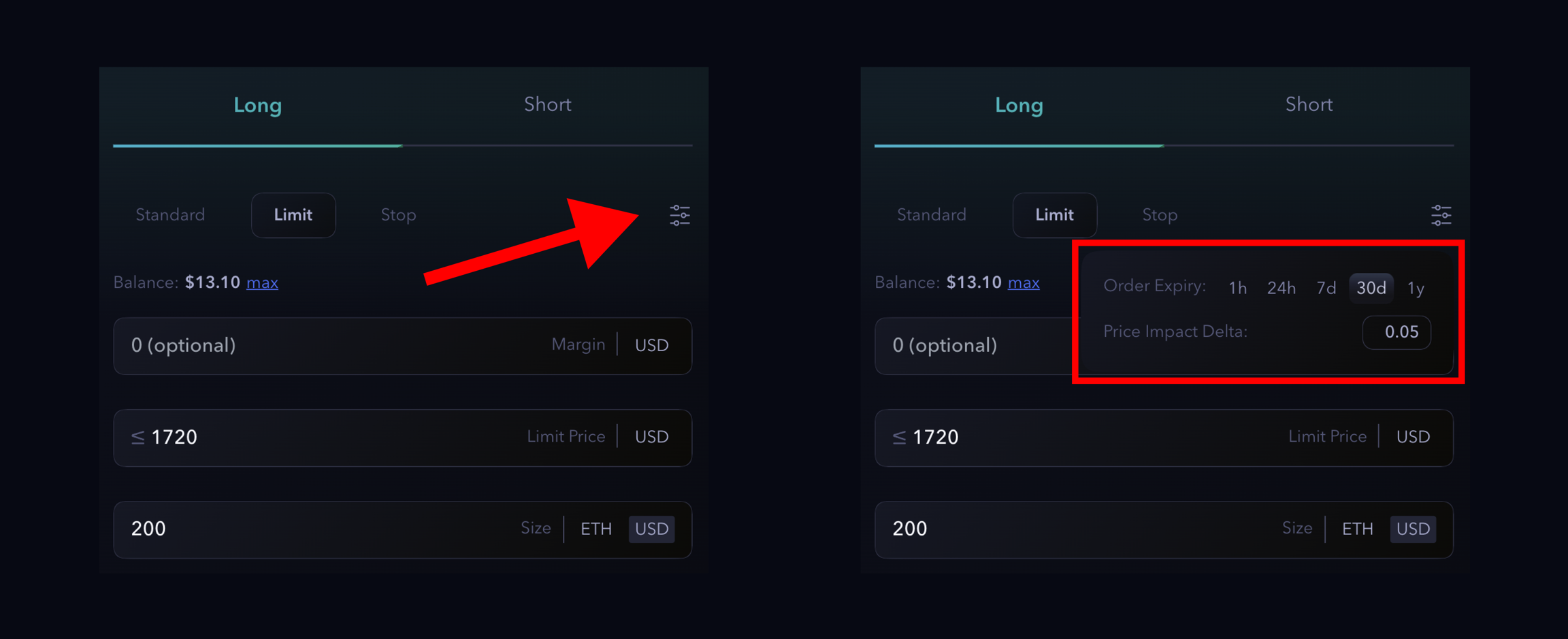 Traders can set the expiry and price impact delta of a new position manually in the UI. It helps the traders to manage their position when there is a huge movement in the market.