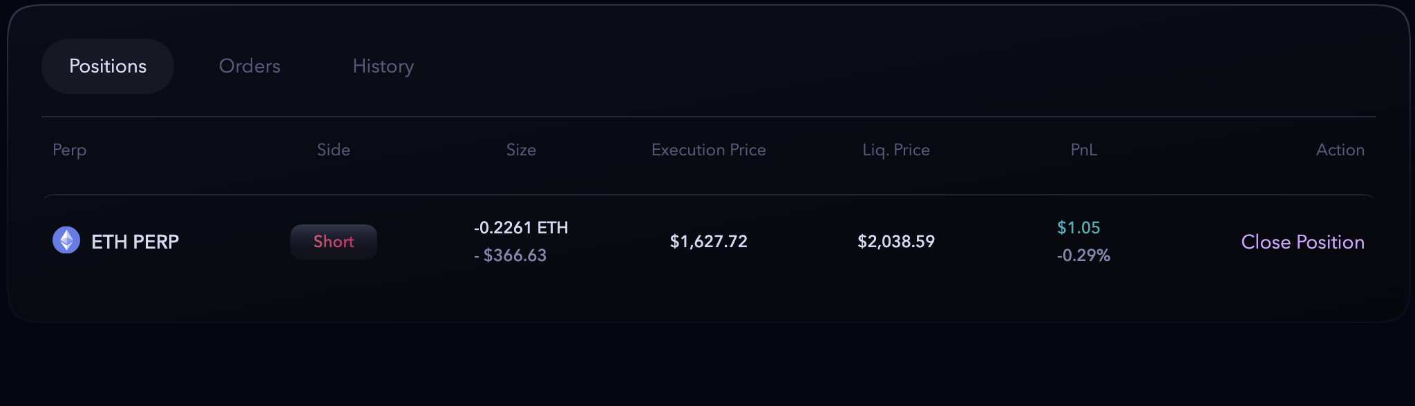 After opening the position, the trade comes on positions, and the trader can manage the trades on this tab. The trader can view the position size, open price, Liquidation price, and PnL on this tab.