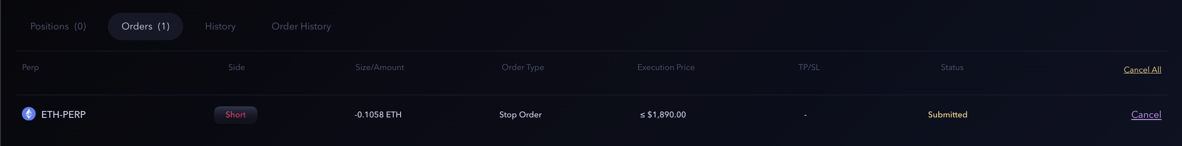 Once the transaction is executed, the order will appear under the Orders tab. Users can cancel the stop order at any point in time.