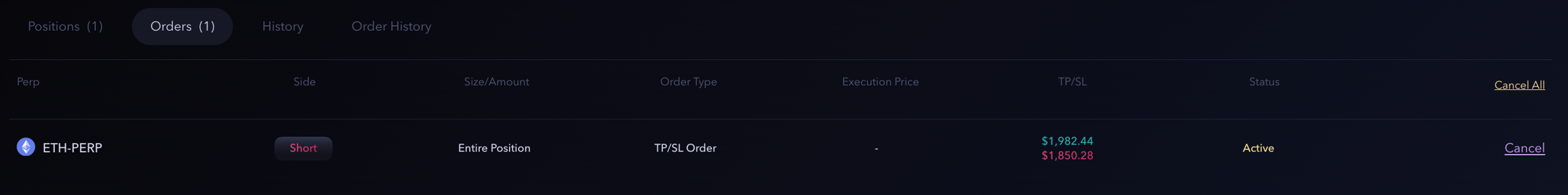 Once validate the transaction the TP/SL will be shown on Order tab and Position tab